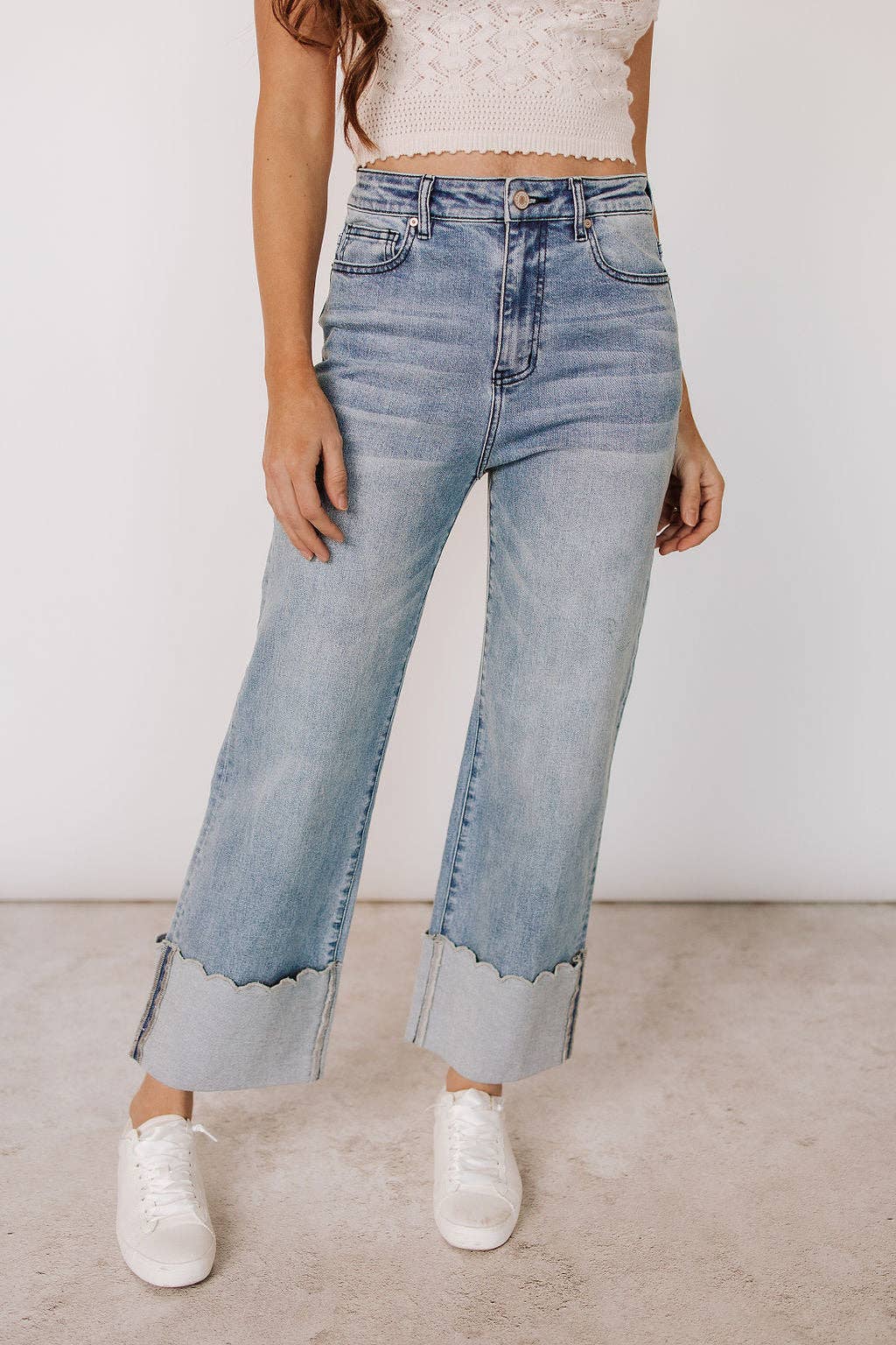 Wide leg fit, stretchy fabric & a scallop cuff hem make this denim not only comfy, but CUTE!