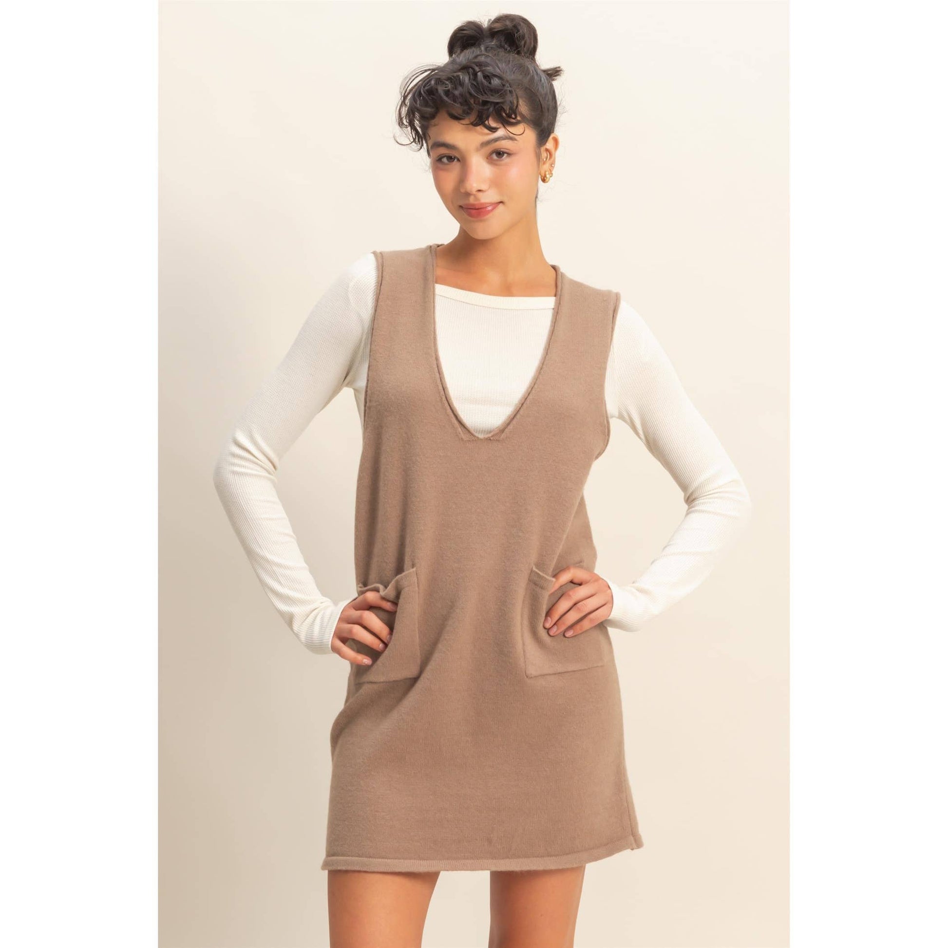 This sleeveless knit mini dress features a deep V-neckline and a relaxed, easy-to-style silhouette. Designed with clean finishing and front patch pockets, it pairs effortlessly with fitted tops or turtlenecks for a layered look. Perfect for fall and winter, its simple lines make it a versatile piece to style stylishly throughout the colder seasons. 40% Acrylic 40% Nylon 20% Polyester Model Is 5' 7" Tall, 32" Chest, 25" Waist, 36" Hips And Wearing A Size Small Imported. Designed In The USA